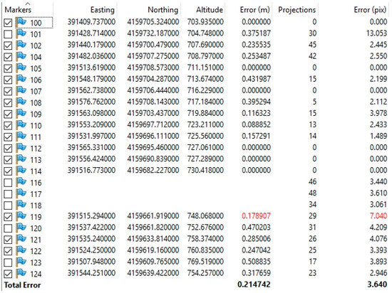 The most accurate result was achieved using only the dataset of 142 images obtained from the 45-degree-inclined camera; however, this was strongly influenced by the adverse natural conditions of the site. In particular, the obtained level of accuracy of the considered GNSS RTK network ranged between 0.088 m and 0.432 m, achieving a total error of 0.214 m (Figure 9). This value was obtained by discarding five targets that possessed a larger GNSS error of accuracy and represents an exhaustive result considering the strongly irregular shape of terrain, the presence of multiple paths, the reduced number of visible satellites, and the impossibility of producing a more distributed GNSS network of the target due to inaccessibility of the surroundings. The final dataset was used to create the point cloud of the outdoor environment.