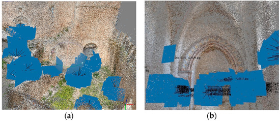 The reconstruction of the outdoor point cloud was the base for the creation of the 3D mesh of the entire monumental complex including the natural environment around it. At the same time, with the same technology, the point clouds of indoor environments of the castle (the baron’s hall, the bedroom, the chapel, etc.) were created (Figure 10a,b). In particular, a realistic 3D restitution of every interior room was developed by considering a huge number of photos taken from different angles and different positions and with some main distances as a reference but without the support of the GNSS network. The level of precision obtained from this operation was satisfactory in relation to the primary goal of this 3D restitution: the creation of a realistic 3D model of the castle with a good level of detail, useful for a virtual tourism application and documentation, and developed using fast survey operations with a reduced number of operators.