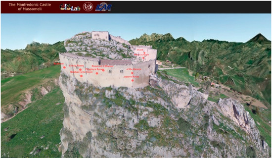 The survey and the photogrammetric restitution of the castle of Mussomeli presented in this paper has illustrated a 3D model processing technique useful for different kinds of representation. It is possible to extrapolate orthophotos, section planes, or other restitution types that could improve knowledge on cultural goods. In recent times, new technologies in computer science have provided the possibility to create, starting from a 3D model, an interactive online representation of a cultural good with a reconstruction of the environment around it [13]. Furthermore, these technologies, together with the latest achievements obtained in photogrammetric restitution, allow the construction of a 3D GIS (Geographic Information System) environment accessible on the web [14]. To get these results and to load online 3D models of monumental complexes, it is also necessary substantially simplify the mesh, finding the right balance between the LoD and the speed of access on the web. Finally, the 3D model of the castle of Mussomeli was used for the creation of a 3D interactive navigation platform (Figure 15) available on the web [15].