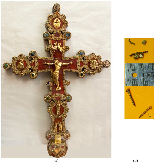 A picture of the artifact and of the investigated specimens: (a) Front of the Chiaravalle cross and (b) filigrees and nails specimens (photograph credit: Franco Blumer).