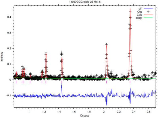 The Time-Of-Flight neutron diffraction (TOF-ND) experiments were run at the Italian Neutron Experimental Station (INES) of the ISIS spallation neutron source (UK); INES is equipped with a system of beam limiters in order to reduce the beam size and to select the gauge volume of interest in the sample, even in the millimetric range. The measurements were conducted in air, and the alignment was made through a laser pointer. INES is frequently addressing cultural heritage investigations [12,13,14,15]. The ND data were processed using Mantid software [16] for data normalization and correction, and then were analyzed with the Rietveld refinement technique using the GSAS (General Structure Analysis System) code [17] with the EXPGUI interface [18].
