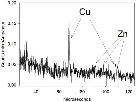 Concerning the nails, the NRCA measurements revealed the presence of copper (main peak at 68.4 microseconds) and zinc (see Figure 5). The presence as minor components of Mn, Fe and Ni could be suggested for peaks at 90, 48.7 and 34.7, respectively. We could also suggest the presence of Co traces (peaks at 30.8 and 143 microseconds). Lead is not evident, nor is there relevant peaks of other elements. The quality of the spectrum is low due to the small quantity of the specimens and for this reason the samples were investigated all together, so we cannot go further into details.