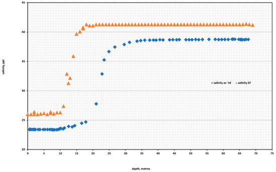Salinity on the AE2 site in September 2007 (orange triangles) and June 2014 (blue diamonds).