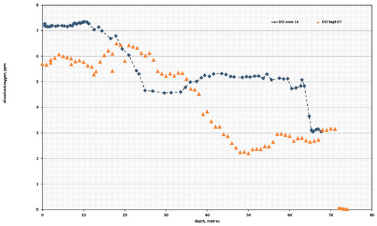 The data from June 2014 showed a dissolved oxygen that fell with increasing salinity, to reach a minimum of 4.5 ppm, and then increased in response to currents flowing in the hypersaline waters at depths until the submarine environment was reached, at 67 m, where it fell to the 3-ppm level seen in 2007.