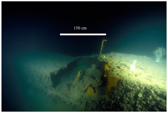 With a depth of 71 m, Equation (3) predicts a corrosion rate of 0.018(3) mm/year, which is the same as the observed rate of 0.017 ± 0.003 mm/year. The silty microenvironment of the submarine would naturally result in an overall lower corrosion rate than that for wrecks lying proud of the seabed in well oxygenated conditions. More simply, the lower sections of the submarine may be in a better state of preservation, but testing would be required to assess the impact of microbially-induced corrosion (MIC) in the lower section of the pressure hull.