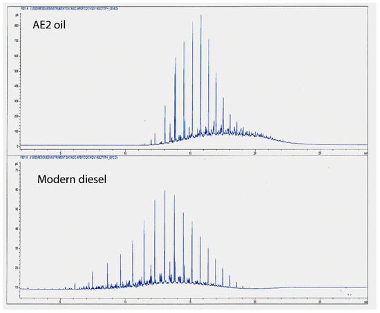 Gas chromatographs of AE2 oils compared with undegraded diesel fuel.