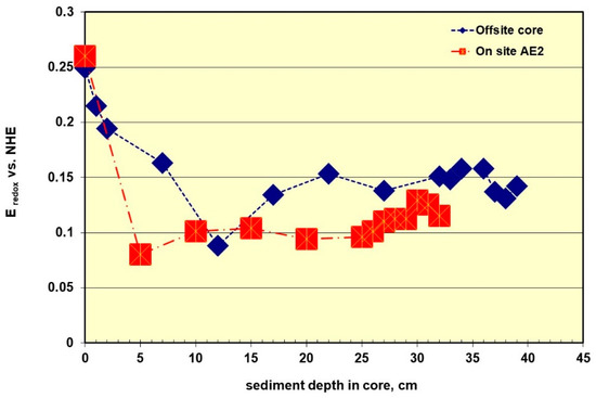The AE2pHcore values showed a steady alkaline microenvironment for the initial 25 cm at pH 7.80 ± 0.02, before rapidly falling over the last 7 cm at a rate of −0.05 pH/cm distance down the core (Figure 8). The change in AE2pHcore may reflect a limiting impact of the vessel on the sediment, since the pH values for both cores coincided at 7.3 ± 0.1 after a core depth of ≈30 cm of sediment. The off-sitepHcore rapidly fell from its initial value of 7.7 to 7.1 ± 0.1 in the first 25 cm of sediment. The dissolved oxygen measurements in the AE2 core recorded seven zero values, with a mean of 0.018 ± 0.023 ppm (i.e., essentially zero), while the off-site core mean was 0.067 ± 0.068 ppm with five zero values.