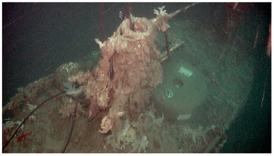 The differences in colonization of the conning tower and the upper sections of the combing indicates that the sediment levels have not always been the same as those found when the site was inspected in 2007. The concretion model indicates an initial four–five years of relatively intense corrosion, as paint layers are penetrated and a steady corrosion rate is established [13]. The primary corrosion layer in the concretion appears to correspond to the first 13 ± two years of immersion (i.e., from 1915 to 1928). Changing conditions due to massive storms disturbing the site resulted in the second and third layers.