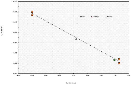 Prior to attaching the anode cables with clamps to the submarine, the surfaces were hydro-blasted to remove small areas of concretion from the metal surface to get ohmic connections. The elapsed time at each attachment point was measured from the time at which the pods were attached and the time when the Ecorr measurements were taken. The observed voltages were dependent on the logarithm of the elapsed time between anode attachment and voltage measurement. The linear regression analysis gives Equation (6), which had an R2 of 0.9648 with an associated equation,