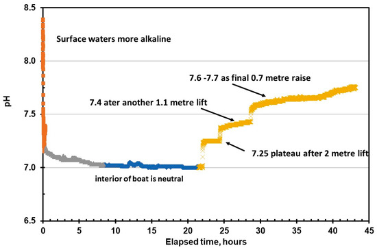 The extended blue line represents the period when the oxygen and salinity sensors were “poisoned” by sulphur species in the stirred-up sediment. When the divers began to recover the Sonde, the purple line and the plateau value of 7.2 represents the solution value in the water column above the sediment. As the instrument recovery operations increased, the plateau readings of 7.4 and 7.6 represent the different chemical microenvironments inside the submarine. The value of 7.4 is for the water 3.1 m up from the floor of the control room and 7.6 is for water at 3.8 m. The latter pH corresponds to the mean pH of the sediment cores from outside the submarine. The values between 7.2 and 7.4, those closer to the internal spaces of the lower control room, correspond with the mean pH (7.26 ± 0.08) from the external core adjacent to the submarine. The equivalent value at the first plateau region of the pH with the sediment core close to the submarine is a strong indication that the chemical processes of diagenesis inside the submarine were the same as those externally, but near the hull.