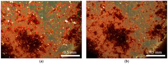 Venetian red ochre after suspension in a 1:1 mixture of water and methanol: (a) before heating; and (b) after heat treatment at a maximum temperature of 580 °C.