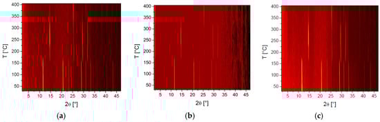 Variable temperature powder X-ray diffraction plots showing clear phase changes of: Venetian red ochre (a); Italian yellow earth (b); and lemon ochre (c).