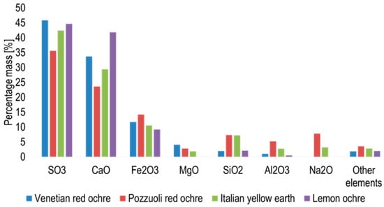 X-ray fluorescence spectroscopy showed the presence of 27 elements in Venetian red ochre (Figure 6). The most abundant element recorded was sulphur, followed by calcium, iron, magnesium and silicon.