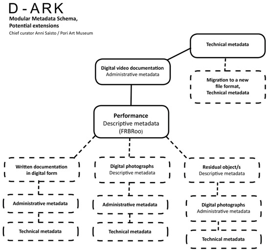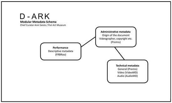 The D-ark metadata schema is modular—the core is a description of the performance. Other parts are administrative information about the video documentation and technical metadata concerning the video file. The idea behind the modular metadata schema is flexibility—it enables additions, e.g., residual objects or textual interpretations, as well as the addition of new technical metadata if the video file has to be migrated to a new file format. The schema has been created using FRBRoo (A Conceptual Model for Bibliographic Information in Object-Oriented Formalism) [14] and standards recommended in the Finnish digital long-term preservation specifications [15].