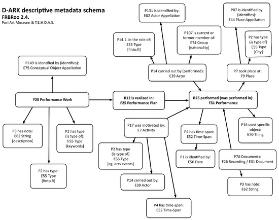 FRBRoo is a conceptual model that provides a unified conceptual model for bibliographic records. It allows the modeling of creative processes in a coherent and integrated way. FRBRoo inherited features from both CIDOC CRM (Cidoc Conceptual Reference Model) and FRBR (Functional Requirements for Bibliographic Records) and it can be used for describing performing arts [25]. Alberto Pendón Martínez and Gema Bueno de la Fuente have discussed potential description models for documenting performance. They recommend using FRBRoo, as it provides a suitable conceptual basis compatible and interoperable with other institutions [26]. The mapped metadata for D-ark performance art documentation consists of three main elements that are also the core of FRBRoo—F20 performance work, F25 performance plan, and F31 performance. Performance work is the intellectual concept of the artwork, performance plan is a blueprint for how to realize the performance work, and performance is the event at which the art work is being presented.