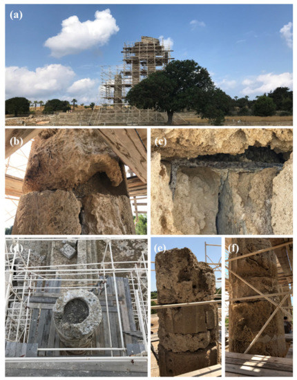 Ancient temples today are in need of restoration, due not only to natural ageing of the materials composing them, after millennia in service, but also due to destruction, vandalism and explosions during periods of unrest or war, and dynamic stresses, as Greece is a region with frequent and strong earthquakes. The building materials of these structures are also subject to environmental factors, such as sea salt spray, in the case of monuments in close proximity to the sea, and consequent salt crystallization; pollution, in the case of monuments which are located in the city center; biodeterioration, and of course the synergistic effect of all the above. Among deterioration factors, the use of incompatible restoration materials, holds an important place, as evident in many ancient temples, where the use of incompatible materials further worsened the state of preservation, demanding the restaurio di restaurio, a supreme example of which is the archaeological site of Knossos [6,7]. This is attributed to the different properties of modern materials, such as cement, which increase rigidity of the structure, cause moisture accumulation in the more porous historical materials, thus accelerating or even triggering consequent deterioration mechanisms, deliver stresses to the weaker historical materials, thus causing damages, while incompatible restoration materials can cause chemical alterations of the historical materials or can introduce dangerous salts into the structure [8,9,10,11,12,13,14,15].