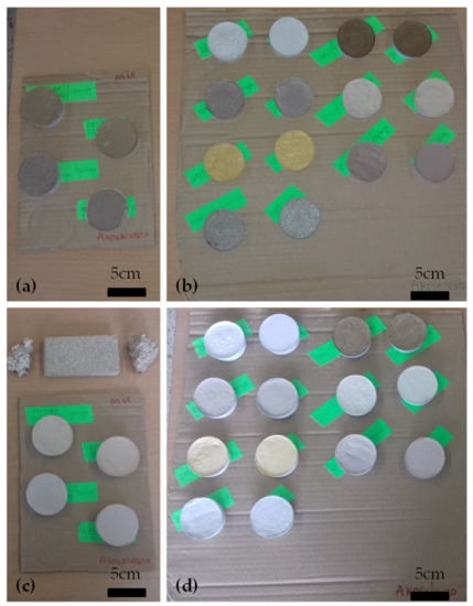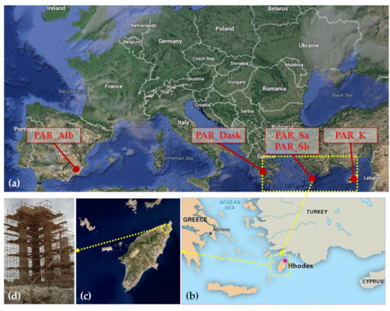 Aiming to select an appropriate restoration stone, stone specimens were examined from five different quarries; the quarries were selected after investigation of which organized quarries in the Mediterranean basin could procure blocks of the required dimensions for the restoration project. Specifically, the lithotypes examined were: (a) a biocalcarenite from a quarry in Murcia, Spain (PAR_Alb), (b) a biocalcarenite from Tochni, Cyprus (PAR_K) and (c) a litharenite from Achaia, Greece (PAR_Dask). In addition, specimens from two different locations (coded Location A and Location B) of an inactive quarry in the area of Stegna, Rhodes were examined, in order to study a locally quarried biocalcarenite as well (lithotypes PAR_Sa and PAR_Sb from Location A and B respectively). The locations of the different quarries are presented in Figure 2a, while the relative position of Rhodes and the Apollo Pythios Temple are presented in Figure 2b–d.
