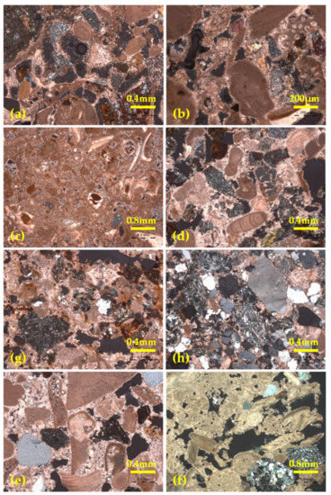 The lithotypes from both locations of the Rhodes quarry were both characterized as calcarenites and presented similar mineralogical characteristics with the historical stone samples (both ancient and Italian restoration). In particular, an intense presence of clastic material is detected in PAR_Sa (Figure 3d), similarly with the historical stones, while sparse marble fragments are also noticed. In PAR_Sb (Figure 3e) there is an abundance of bioclasts, in some areas substituted by sparitic and micritic material, lithic clastic fragments, as well as crystalline fragments, while iron oxides and hydroxides are sporadically discerned. The binding material of both lithotypes from the Rhodes quarry is sparitic (cement). The stone from the quarry in Spain was also characterized as a calcarenite (Figure 3f). The clastic material present is bioclasts (fossil fragments) and clasts, with the former prevailing. The clastic fraction is mostly crystalline (quartz), while lithic clasts are present in a smaller abundance. The binding material of the stone is characterized as sparitic and is present in a very small percentage, while a large number of voids and pores in the sample is noticed. The stone from the Cyprus quarry is also a calcarenite (Figure 3g). It is rich in clastic material, and specifically lithic clastic fragments, crystalline fragments and bioclasts (fossils), the latter present in small quantity. Iron oxides and hydroxides are noticed sporadically. The binder is characterized as sparitic (cement). The stone from the Achaia quarry is a calcitic sandstone (Figure 3h). There is an abundance of clastic material, with an equal presence of lithic and crystalline fragments, however, in contrast to all other samples, bioclasts are almost absent. Iron oxides and hydroxides are sporadically detected. The binding material is characterized as calcitic.