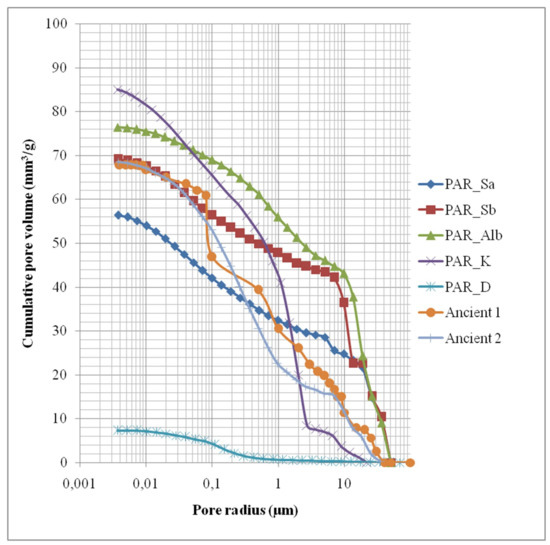 Cumulative pore volume curve in relation to pore radius for quarry and historical stones.