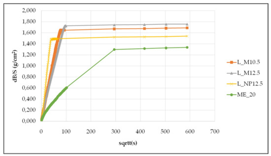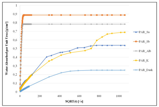 Water absorption through capillarity of each quarry stone was studied. The capillary rise coefficient of each quarry stone (three cubic specimens from each quarry stone) was estimated in accordance to EN15801. The estimated capillary rise coefficient and water absorption capacity through capillary of each stone type is stated in Table 4, while in Figure 5 typical test results for all quarry stones are depicted, presenting the amount of absorbed water by surface area (g/cm2) in relation to the square root of time (sec1/2).