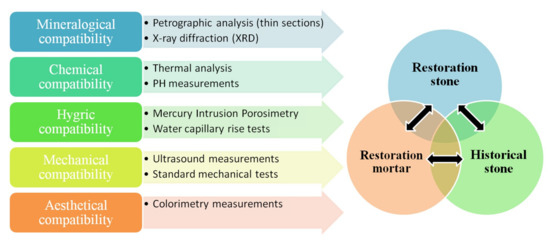 When deciding upon the selection of a lithotype, which is to be used in a restoration project, compatibility between the new stone and the historical/ancient stone is of paramount importance; however, as Greece is a country of high seismic risk, compatibility must always be accompanied by the appropriate level of performance, in order to avoid failure of the structure and to achieve sustainability. The same is true when selecting the restoration mortar, which is to be used to join together either ancient stone members or new stone members or new stone members with historical stone members. In the present study, as presented in the previous sections, a number of techniques were applied, each one providing valuable information, crucial for the assessment of compatibility between the historical stone and the restoration materials, as well as between the restoration materials themselves (new stone and restoration mortar) (Figure 8). In the present section the results of the previous sections will be summarized and discussed, aiming to highlight compatibility and performance issues, which, if properly addressed, can ensure sustainable preservation of a monument. The importance of using many complimentary techniques is highlighted, as their combination is necessary in order to obtain all required information for decision making.