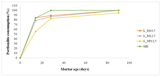 Regarding the assessment of the restoration mortars in terms of chemical compatibility, the early consumption of portlandite is of paramount importance. The presence of portlandite, causes high specific conductivity, creating dynamic conditions between different materials, and a higher hydrogen potential (pH), which can prove damaging for calcareous substrates. In the following figure (Figure 9) the percentage of portlandite consumption in relation to the portlandite percentage at 0 days of each mortar mix [(M0days − Mt)/M0days*100%) is illustrated in relation to mortar age.