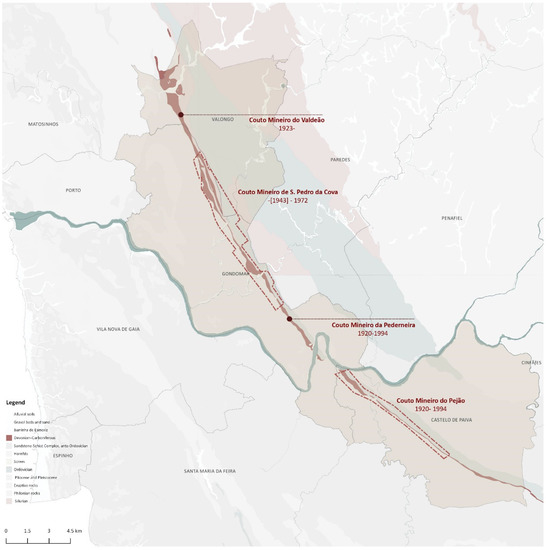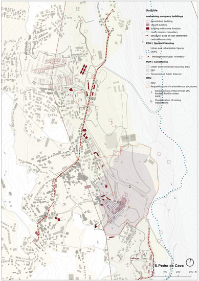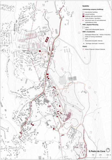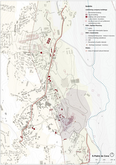 In 1995, it was recognized that more than any heritage safeguard, the mining issue was considered due to the alterations provoked in the subsoil, identifying within the “coal mining concession areas” the “mining subsistence areas” [18] (Figure 5). In S. Pedro da Cova, 46 years after the closure of the mines this geomorphological issue raises an environmental aspect, identifying the area related to the delimitation of the Couto Mineiro de S. Pedro da Cova as “Geological Resources—Areas in recovery” [19] (Figure 4).