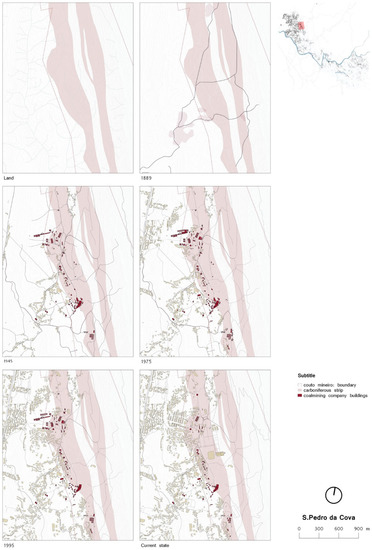 Both correspond to the central nuclei of Couto Mineiro de S. Pedro da Cova and Pejão including “mining works accessories” [30] which established urban settlements, supported within the administrative, and the functional and economic autonomy of the Coutos Mineiros. These are the nuclei by which it is possible to recognize a model of urbanization—imported—through which it was sought to optimize productive processes while, on the other hand, to respond to the problems introduced by a rapid industrialization process [31] (Figure 3). They represent the “success of a long-lasting historical process” [7] (p.152).