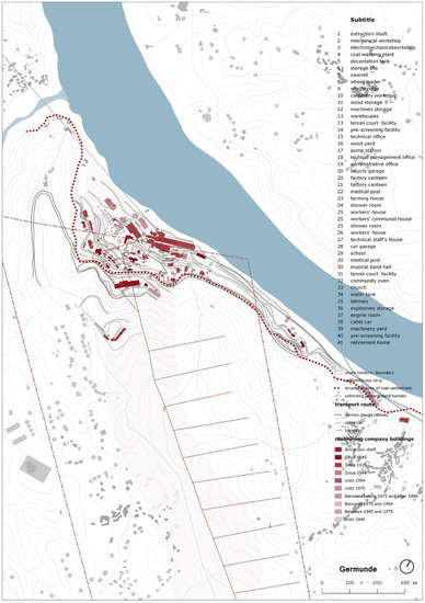 Outside of this ARU, there are a series of structures that are part of the urban nucleus determined by the coal industry particularly facilities (health centre, medical post, water tank), structural axes of the coal settlement, etc., as shown in Figure 6.