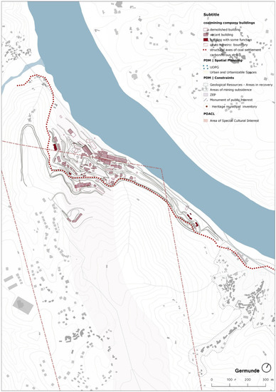 With regard to the PDM of Castelo de Paiva, published in the year following the closure of the Pejão Mines, there is no safeguarding in the heritage and/or cultural domains with regard to the permanent features resulting from mining activity which is understood in the nucleus of Germunde as “Urban and Urbanizable Spaces” in part “consolidated” and in part “for urban expansion” [18] (Figure 5).