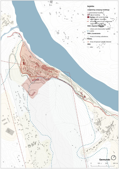 The disparagement of the logics of landscape construction is also shown through the delimitation of the ARU and the programming of the AEIC as museological units. This intervention strategy is removed from the idea of the whole: In S. Pedro da Cova the reading of the urban settlement as being determined by coal activity is lost by not considering spaces other than those of work, as shown in Figure 6; in Germunde, contrary to the guidelines of the TICCIH (The International Committee for the Conservation of the Industrial Heritage) [37] for the understanding of the industrial heritage, the urban settlement resulting from such operations is isolated destroying its reading as an integral part of a productive territorial system in scope, as shown in Figure 5.