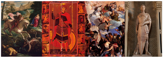 The depictions of the saint are quite heterogeneous, and display him in very diverse situations. Spanning from the sixth century to this very day, representations of Saint George have depicted him as a haloed, beardless knight in different poses and scenes. Initially painted standing in his military attire, he was later represented in various scenes such as the laceration on the wheel, the resurrection of the dead and the destruction of idols, which are strongly linked to his biography and his legends [44]. While, currently, the most widely known iconographical type is surely “Saint George and the dragon,” which portrays the saint slaying a dragon and saving a princess, it was only from the 10th century that he started to be represented on a horseback killing a dragon (Figure 2 for a small overview of Saint George iconography).
