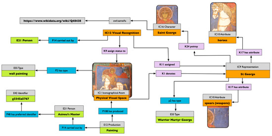 The graph in Figure 3 outlines the map of the information about the panel of Saint George in the church of Asinou. The map presents the description of the Visual Recognition of the representation of Saint George, which assigns the status of a representation to the iconographical atom in the south lunette of the narthex of the Asinou church. The representation is identified here as “Saint George.” However, the recognition of a specific subject is dependent on the knowledge the interpreter has of the context of production. A felicitous recognition is conditioned by a grasp of the context of the artwork, because, while many would recognise Saint George as the main subject of this wall painting, many others, not familiar with Christian iconography, would only recognise a man riding a horse. An expert in Byzantine iconography could instead quickly identify him as Diasorites, a more specific iconographical type. It is important to underline that such diversity in classification in respect to the same representation is, indeed, possible. The modelling in Figure 3 does represent only one of these possible recognitions (the one originally described in the record), but the same assertion, which assigns a representation value to an iconographical atom, is repeatable. We could have, therefore, an instance of IC1 Iconographical Atom acting as a hub of diverse visual interpretations carried out by different art historians who do not share the same knowledge on the subject, or who decide to diverge on the type of attribution (e.g., generic vs. specific). The (possible) selection of a chosen interpretation is not an ontological problem but an institutional one, and should be carried out on the basis of the provenance of the selected assertions.