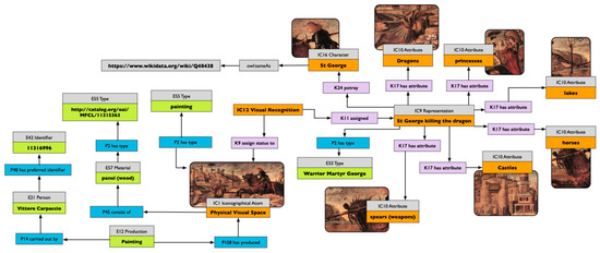 Figure 4 presents the map of the description of “Saint George killing the dragon” by Vittore Carpaccio from the Photographic Archive of the Harvard University Center for Italian Renaissance Studies. It is easy to see that in this representation, the figure of Saint George is richer in attributes (Castle, Princess, Lake and Dragon) in respect to Figure 3. The two representations of Saint George in Figure 3 and Figure 4 do carry their own diverse identities, but can be easily correlated using their shared set of elements. The correlation can be based, for example, on the depicted character. In this instance, they both describe the character called Saint George, and even if the nomenclature in the two records is not the same (in Figure 4 we have St George, while in Figure 3 we have Saint George), they both use external resources (in this case Wikidata) to define the identity of the portrayed character. Another important feature that can be used for correlating the records is the class Attribute. The two attributes used for the description of the panel of Saint George in Asinou are also used for the description of Saint George by Vittore Carpaccio. While the latter uses a larger set of elements, the spear and the horse are shared by both representations, and, if adequately modelled, we would be able to link the representations on the basis of the visual elements used to characterise the saint.