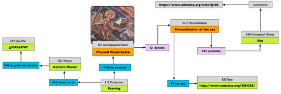 Figure 5 presents a map of information on the personification of the sea present in the narthex of the church of Asinou, Cyprus. The relationships described in Figure 5 are quite similar to the ones used for the description of a Representation, but, in this case, the symbolic link with a conceptual object is made explicit. As for the representation of Saint George, the characteristics of a personification can also be shared by similar representations, so it is crucial to link the semantic information with external reference resources. In Figure 5, for example, both the symbolic object and the personification are linked, with Wikidata and Iconclass, respectively.