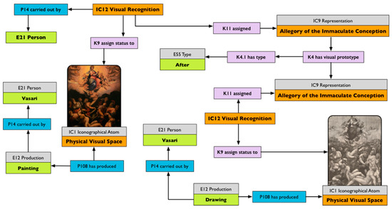 The purpose of these graphs is to provide to the reader with an example of the applications of the developed ontology, as well as to display how the information present in just a small portion of a wall painting, if correctly described, can help create an information-rich environment that opens the doors to new ways to document a heritage object in relation to its functional and visual context. For easy reading, we specify that the letters K and IC represent, respectively, the properties and the classes of the VIR ontology colour-coded in the graph in purple and orange, while the letters P and E, colour-coded in blue and green, represent the properties and classes belonging to the CIDOC-CRM ontology.