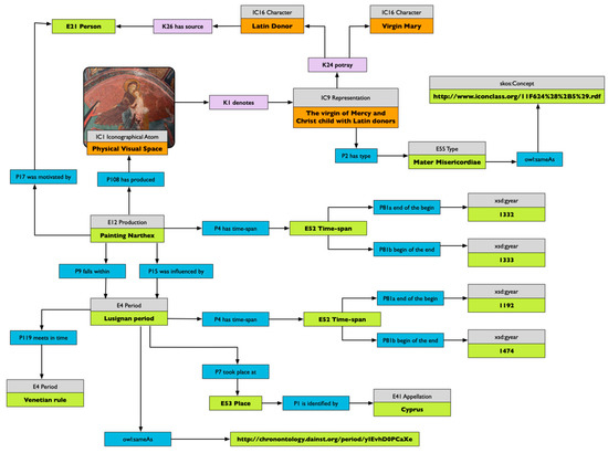 The descriptions of the ontology and the examples have been, until now, dedicated only to the description of the visual, overlooking another essential component in art, the historical aspect. In order to accurately describe a representation as a product of its time and space, and bind it to specific traditions or visual culture, it is essential to ground the visual information into a bigger historical framework. This approach enables users to focus not only on aesthetic attributes, but also on the development of symbolic forms or characters within a period. The church of Asinou proves to be again an excellent example to explain the importance of such practice. The top part of the south conch in the narthex of the church hosts the panel “Virgin of Mercy and Latin Donor,” an iconographical type original from the West. This iconography, called Madonna della Misericordia, originated in Italy in the early 13th century and was promptly disseminated in the Mediterranean area by the crusaders [49].