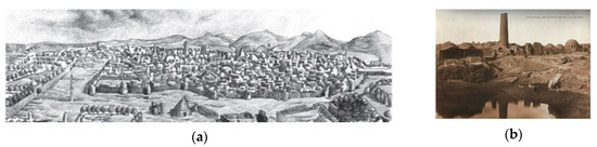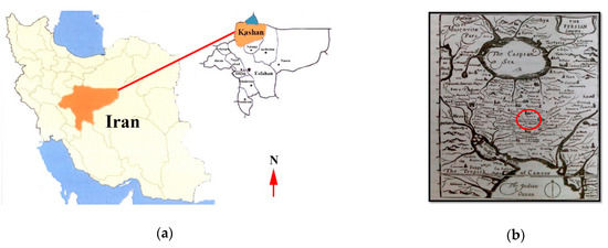 (a) Picture of the city of Kashan by Jean Shardin, 1993 [16] (pp. 533–539); (b) picture of the city of Kashan [17] (p. 499).