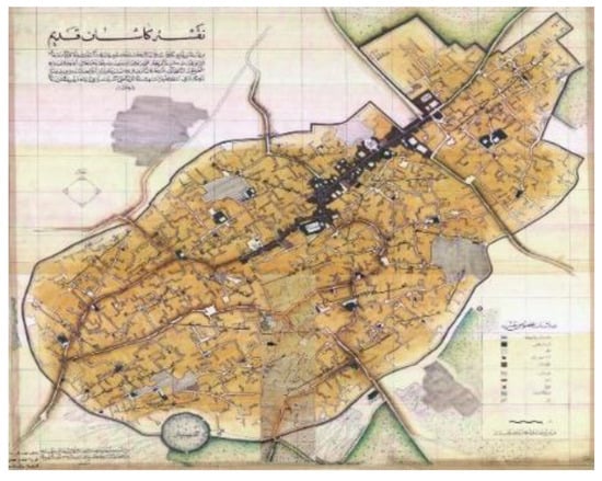 Map of Kashan City in Qajar fence, drawn by Shahr o Khaneh Consulting Engineers, 1995 [12] (p. 23).