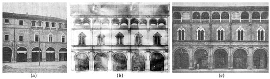 (a) Palazzo Albertini before the restoration [10] (p. 20); (b) Luigi Corsini, restoration project for the façade of the Palazzo Albertini, 1929 [1] (p. 143); (c) Palazzo Albertini (which became the Casa del Fascio in Forlì) after the restoration [10] (p. 21).