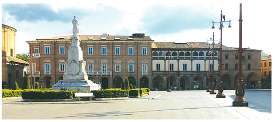 - Favaretto, G.; Mariotti, C. Planning the past. Rimini and Forlì in the 1920s: the replanning of two squares in Romagna. In Townscapes in Transition. Transformation and Reorganization of Italian Cities and Their Architecture in the Interwar Period; Enss, C.M., Monzo, L., Eds.; Transcript: Bielefeld, Germany, 2019. [Google Scholar]