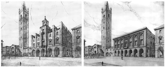 The process—started in the big centers at the end of the 19th century because of the necessity of nourishing a national spirit after the Italian Unification in 1861—arrived in the small towns, such as Forlì and Cesena, with a little delay but with a considerable impact. In the same years, although the national theoretical debate had gone beyond the stylistic position, it is possible to observe similar approaches in the surrounding territory. The interventions of Giulio Ulisse Arata for the Casa del Fascio in Bologna and Dante’s Area in Ravenna [27], or the works executed on the Town Hall buildings overlooking the Piazza Cavour in Rimini [4] are exemplary in these terms, as they all represent an endeavor to use the past in order to build contemporaneity.