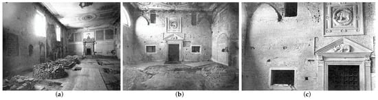 Malatesta’s wing in the St. Francis Convent. Stratigraphic tests executed after the 1925 works. (a) The Piana Library, photo: Tartagni [5] (p. 67); (b) the entrance to the Malatesta Library, photo: Tartagni [5] (p. 66); (c) detail of the stone entrance portal to the Malatesta Library, photo: Dellamore [5] (p. 63).