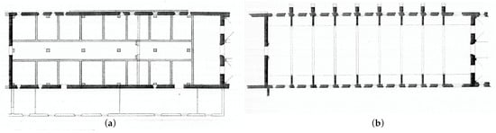 Thanks to his professional experience, he was able to reconstruct the foremost transformations of the wing and to assume the Malatesta configuration as corresponding to a central corridor with the monks’ cells placed on the sides (Figure 6a). According to this interpretation, and because of the abovementioned structural problems, he rhetorically evaluated the possibility of demolishing and rebuilding the outside longitudinal walls for solving the balance problem. However, the idea did not satisfy him, especially from a theoretical point of view: “after all, even if we tear away from the reasons of the heart, the regular rebuilding of these overhanging walls will be reprehensible. Indeed, if the main architectural elements could be redone with a relative fidelity, the small traces, the almost imperceptible signs, the seemingly negligible minutiae with which the building tells its story would escape a precise reproduction, and in any case, it would lose any value of authenticity” [20].