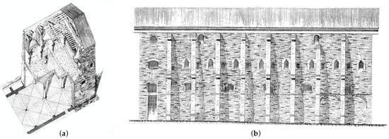 Amilcare Zavatti, Malatesta’s wing in the St. Francis Convent. Project of restoration. (a) Axonometric [5] (p. 9); (b) façade characterized by the buttresses [5] (p. 14).