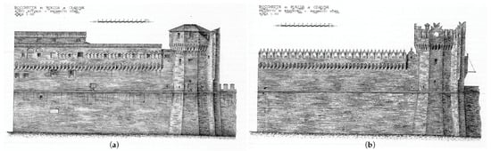 At the same time, the chosen figurative reference for the project of the Library and the same fortress revealed a specific personal interest in Medieval architecture that was effective to the point of inserting his work in a regional (but also national) panorama of neo-medievalist inspiration, even if with at least two decades of delay [26]. The architect–engineer spent much time studying Medieval architecture and wrote many essays about other buildings of his land [5], and this helped him in working by analogy. Although the national debate had already concluded on the importance of giving equal attention to all the phases of life of a building, when describing the results of the tests on the masonries, he stated that only the Malatesta’s part deserved the restorers’ attention [20]. In addition to that, when working on the fortress, he would have given great emphasis to the Venetian–gothic decors of the lodge, and his proposal aimed at cleaning and emphasizing the reading of those existing elements, such as the battlements and their finials, that were able to bring back the mind to an ideal Medieval castle.