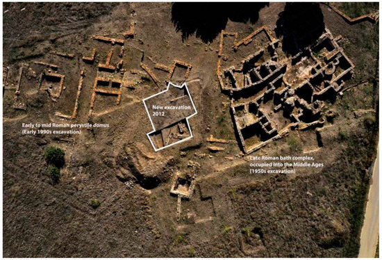 Specifically, the area includes urban structures recognised as boundary walls; residential buildings (a domus); roads, of which one is paved, with others perpendicular to it; a series of workshops; a monumental fountain overlooking the street; and a large complex probably for public thermal use [2]. The structure of the latter was based on pre-existing contemporary construction from the urban settlement of the II century AD, but with a primitive core from the Constantinian age and its numerous subsequent annexations. Outside the walls, there is also an early Christian basilica with a sepulchral area both inside the building and outside the apses [3,4] (Figure 3).