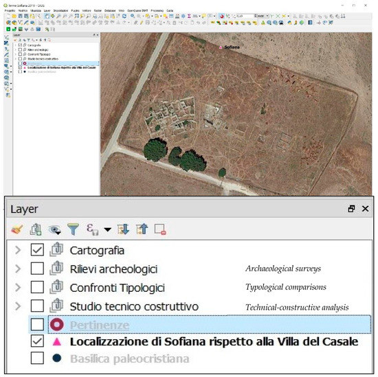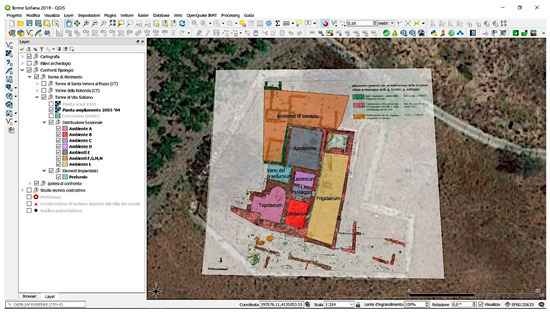 To dynamically manage the data acquired during this study, and increase their ease of use despite their different and presumably distant nature, a "digital container" was conceived by adopting the open source QGIS (software GPL, ver. 3.4.5) and appointing the project ArcheoGIS to exploit the potential of the information system when applied to the archeological sector [12,13,14,15]. First of all, the choice of a GIS platform to be used as a variegated container of information was dictated by the need and desire to make fields of study that are apparently independent of each other coexist and meet. With a view to sharing and interconnecting multidisciplinary experiences, this digital report tool immediately proved to be suitable and versatile.