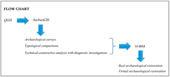 Therefore, as this archaeological complex faced different and multidisciplinary optics (geometric–dimensional, material–constructive, typological–distributive), it is important to go back to the “essence” and retrace the excavation campaigns to try to fill the gaps “left on the field” with technological means and tools (laser scanner, diagnostic analysis, typological overlapping) and with the help of GIS methodology to localize, integrate, and contain all the acquired data, and to test the same with an H–BIM methodology for an archaeological modelling.