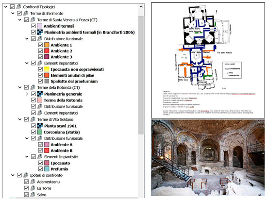 Historical and modern cartographies were put into a system, and relationships were determined between them and were taken as bases on which to locate—from the macro to the micro scale—the entire Contrada Sofiana, the archaeological area, the structures, and specifically, the Spa with its constructive parts to reach the level of detail of the constituent components (stones, bricks, coccipesti, marbles, metals, etc.). All of this was done in a reversible vista of “zoom in” and “zoom out” allowing minor or greater knowledge deepening by accessing external contents that could be recalled.